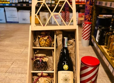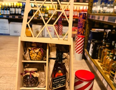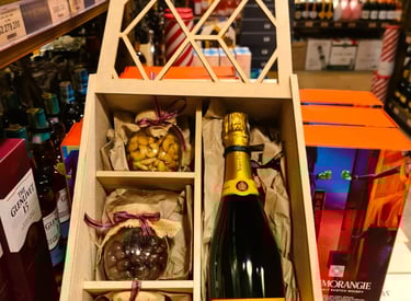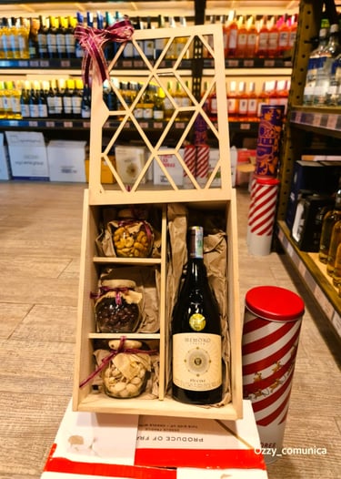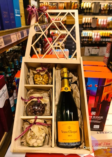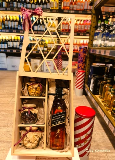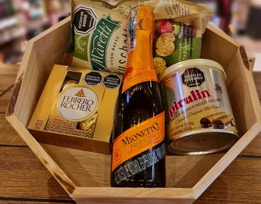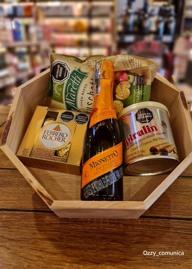 PRESENTACION EN CAJA OCTOGONAL QUE INCLUYE: PIBA DE VINO o CHAMPAÑA o PROSECCO o CAVA o DESTILADOS + MANI + GALLETAS + CHOCOLATES